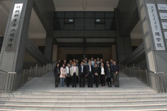 行政办公区域,并与参加组织生活会的成员们在材料基础学科大楼前合影留念。