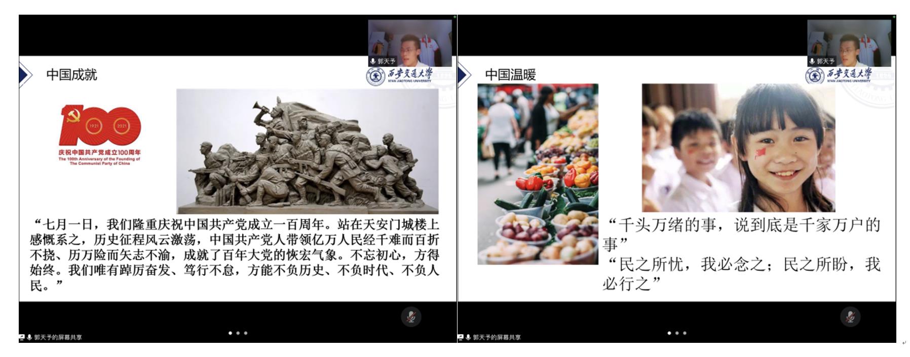 支部成员郭天予同志带领同学们回顾习近平总书记新年贺词,学习了中国成就、中国温暖、中国生态、中国担当。郭天予同志还在会中分享了自己的感悟:新冠肺炎疫情的大背景下,我们在贺词中看到了中国担当,“截至目前,中国累计向120多个国家和国际组织提供20亿剂新冠疫苗”;同时也看到了世界前景,“世界中国各国风雨同舟、团结合作,才能书写构建人类命运共同体的新篇章”。