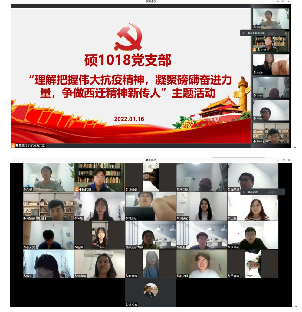 1月16日晚7点,硕1018党支部在线上开展党日主题活动——“理解伟大抗疫精神,凝聚磅礴奋进力量,争做西迁精神新传人”。会议旨在充分发挥党支部战斗堡垒作用和党员的先锋模范作用,保障教学科研等工作平稳运转。支部全体党员和积极分子参加本次会议,会议邀请一品探花