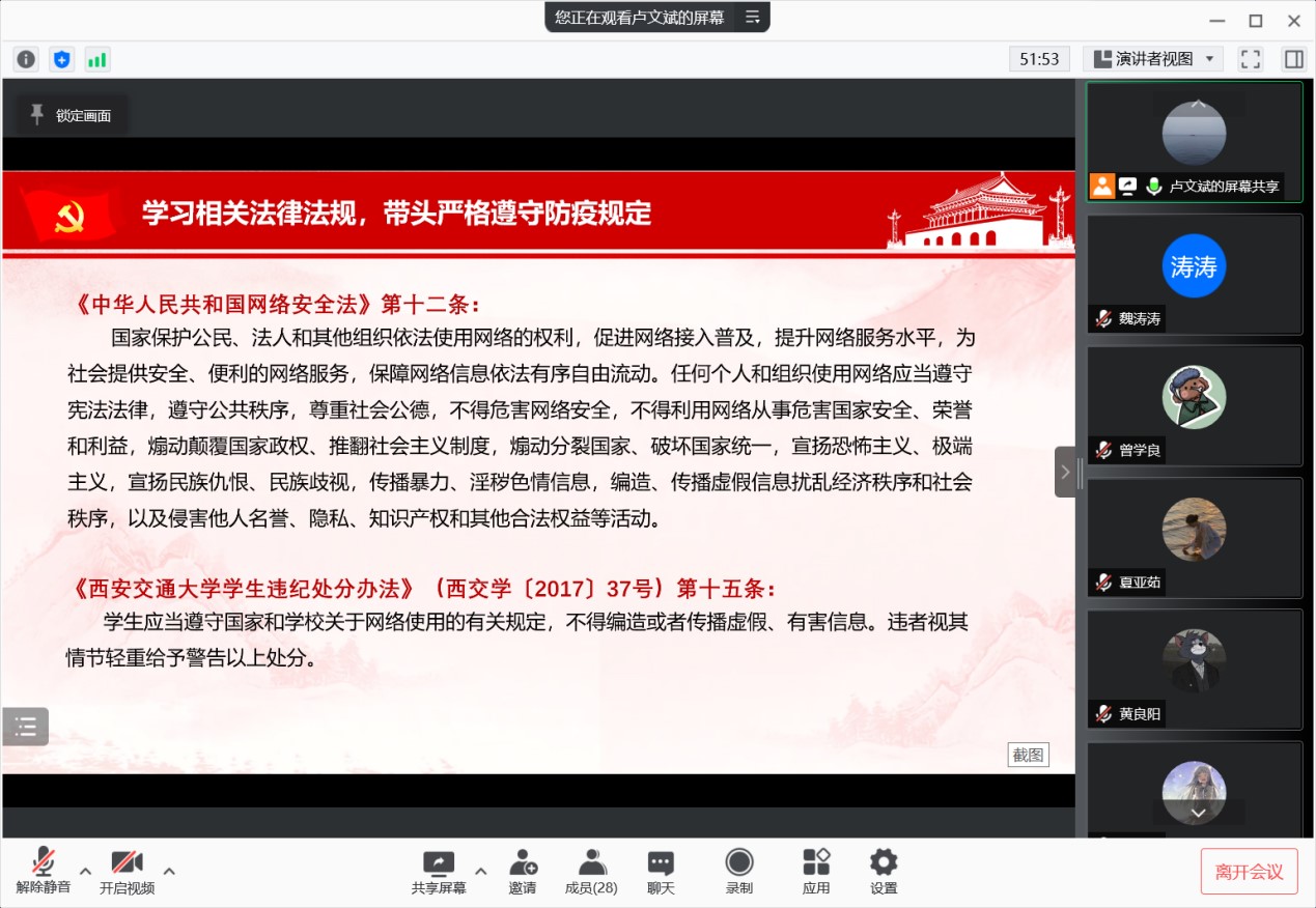 通过此次组织生活会,硕1020党支部加强了对党史的学习,深刻感悟到习近平总书记的人民情怀,理解把握伟大抗疫精神和西迁精神,认真学习《网络安全法》等法律法规等政策规定,共同提高法治素养,身体力行做疫情防控的参与者、防控知识的传播者、疫情谣言的制止者。我们相信有党中央的领导,这场疫情防控阻击战的胜利就在不远的将来,中华民族的伟大复兴就一定能实现。