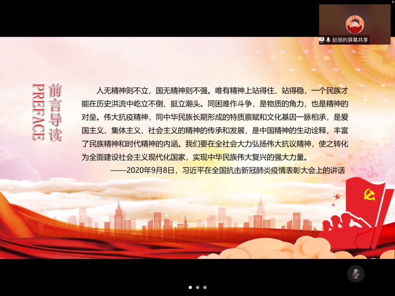 接下来赵旭同志重点展开了对伟大抗疫精神的讲解,首先解读了习近平在全国抗击新冠肺炎疫情表彰大会上的讲话:伟大抗疫精神,同中华民族长期形成的特质禀赋和文化基因一脉相承,是爱国主义、集体主义、社会主义的精神的传承和发展,是中国精神的生动诠释,丰富了民族精神和时代精神的内涵。同时呼吁我们要在全社会大力弘扬伟大抗议精神,使之转化为全面建设社会主义现代化国家,实现中华民族伟大复兴的强大力量。我们举国同心,舍生忘死,尊重科学,命运与共,最终顽强的克服疫情。在此大背景之下,我们交大青年要争做西迁新传人,并对老一辈交大西迁经历进行了生动讲解。