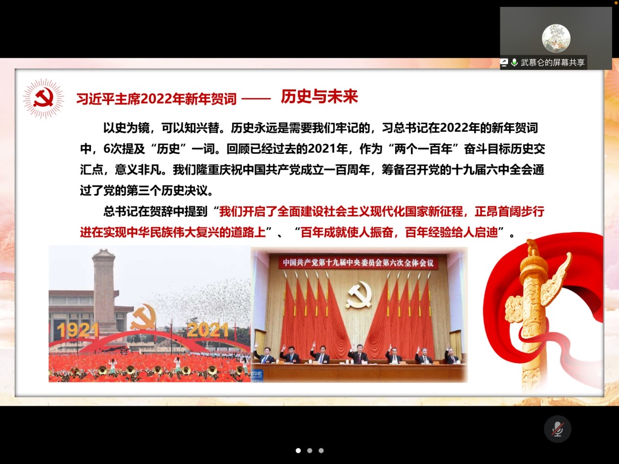 接下来武慕仑同志从历史与未来,环境民生,成就三个方面总结了我党的2021,重点提到了我们要常怀远虑、居安思危,保持战略定力和耐心,“致广大而尽精微”,“像保护眼睛一样保护生态环境,像对待生命一样对待生态环境”。并谈及未来,对2022进行展望与问候:让我们一起向未来!祝福国泰民安!。
