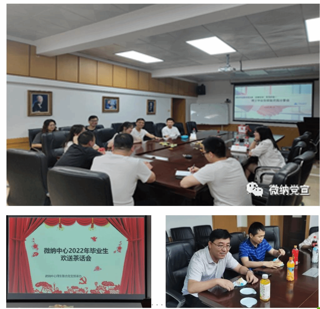 院长单智伟同志、微纳师生联合党支部书记韩卫忠同志、微纳中心主任匡文军同志、实验技术组郭朝维老师、中心青年教师、2022届中心全体毕业研究生参加了茶话会,在会上毕业生们敞开心扉,回顾了科研生活中的趣事,送上了对老师与中心的感谢,表达了对师弟师妹们的美好祝福,各位老师也欢迎大家常回来看看。本次活动加强了毕业生与微纳中心的情感纽带。