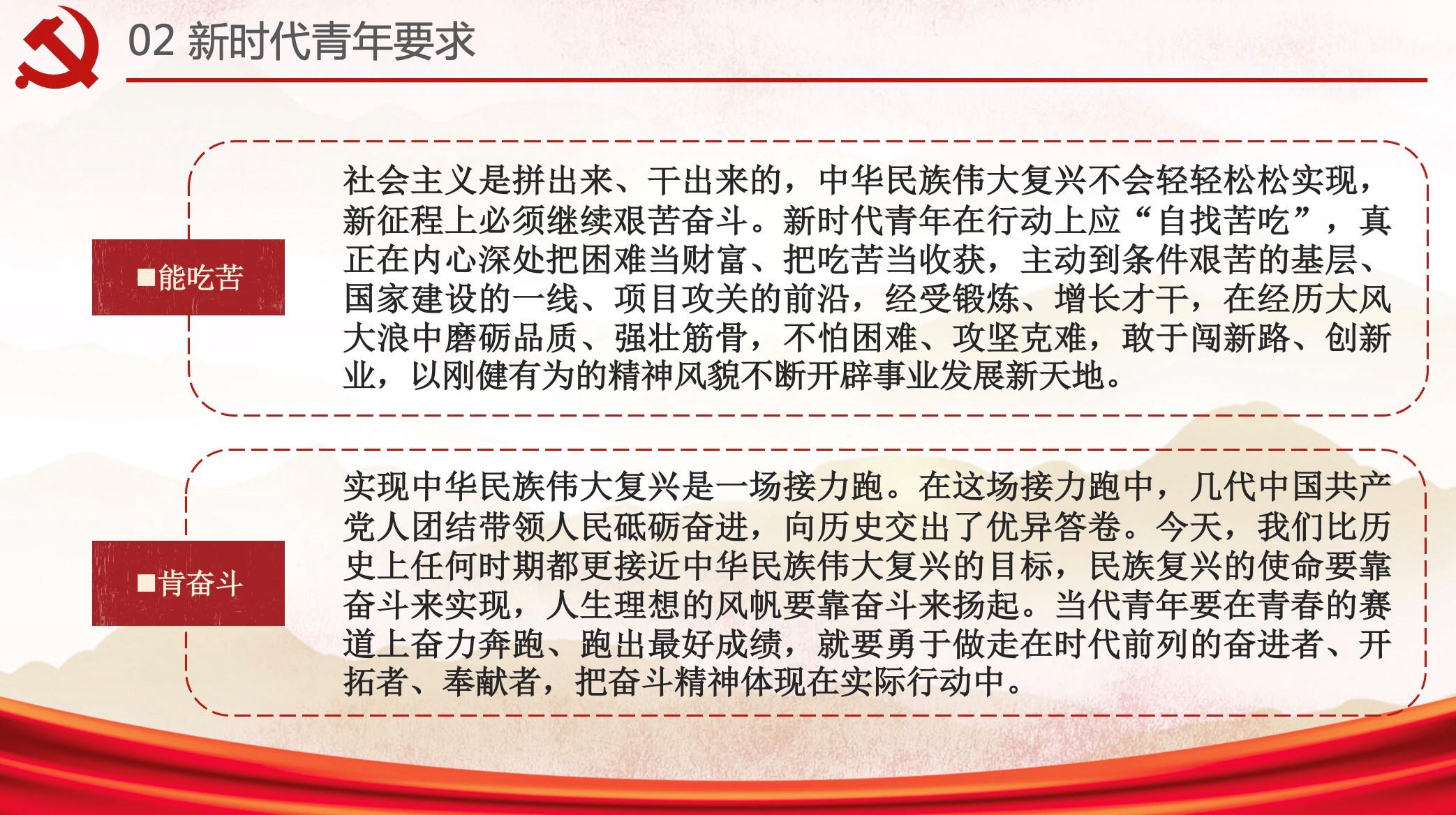 接着,会议围绕“新时代青年要求”展开。习近平总书记在党的二十大上的报告强调“青年强,则国家强”;指出“当代中国青年生逢其时,施展才干的舞台无比广阔,实现梦想的前景无比光明”;对广大青年提出了“立志做有理想、敢担当、能吃苦、肯奋斗的新时代好青年”的重要要求。邓真桢同志强调了“有理想、敢担当、能吃苦、肯奋斗”的具体内涵与要求。