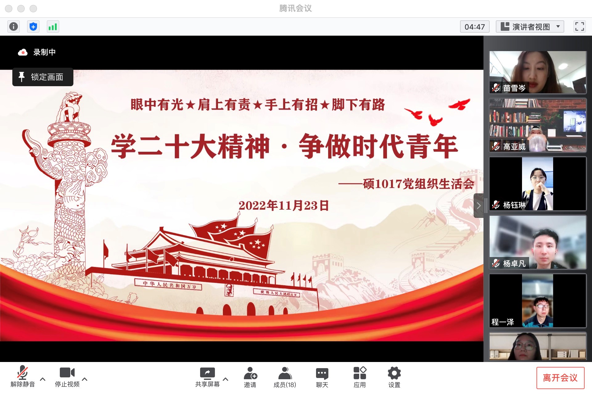 为深入学习党的二十大精神,领悟习近平新时代中国特色社会主义思想,提高支部成员党性修养,11月23日19:30,硕1017党支部在腾讯会议开展了以“学二十大精神,争做时代青年”为主题的组织生活会。一品探花