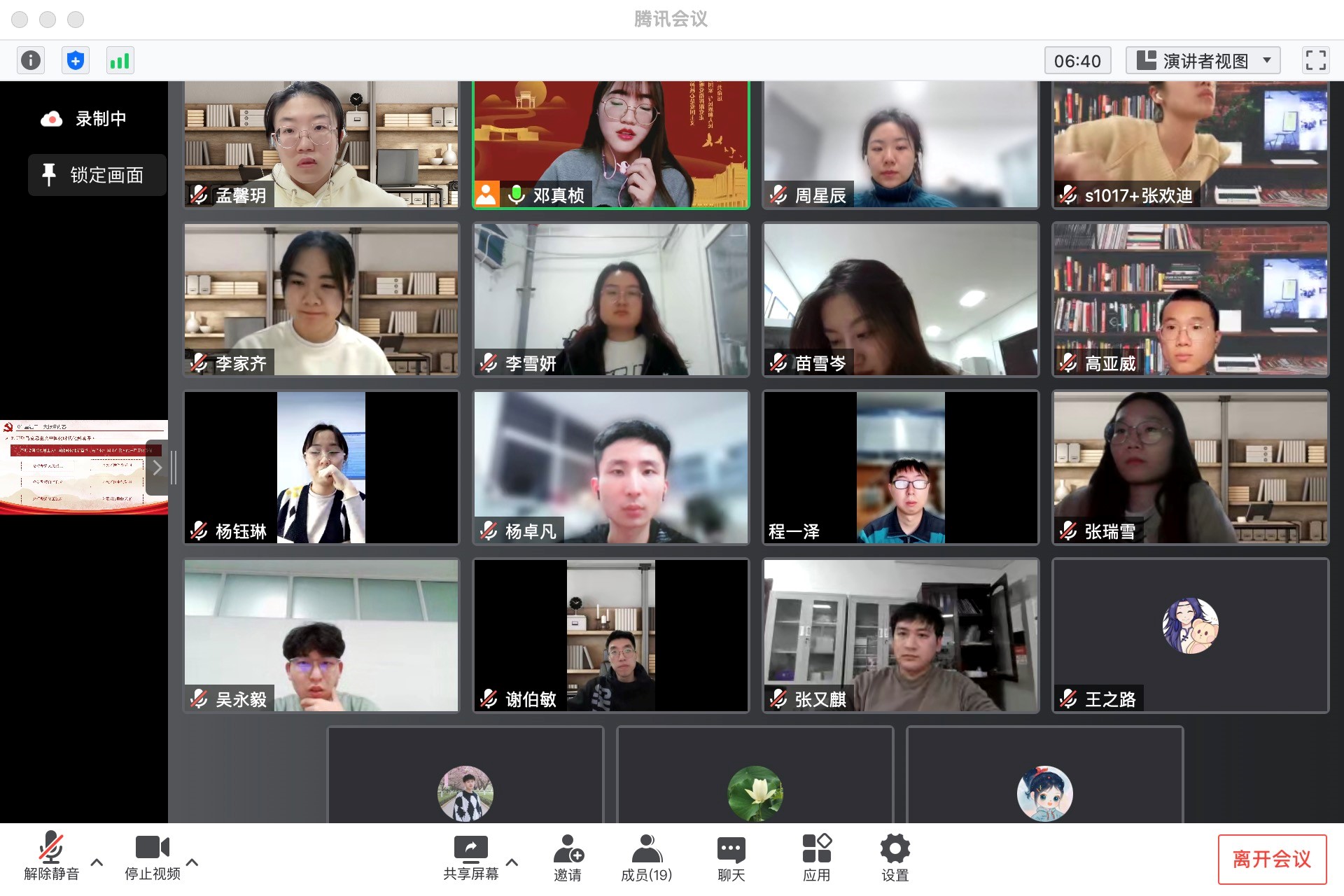 分党委委员孙巧艳同志、硕1017党支部党员及入党积极分子共计19人次参与本次会议。会议由硕1017党支部书记邓真桢主持。