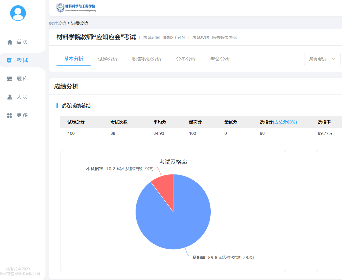 师生应知应会考试系统”,助力一流学科凝聚一批优秀老师,通过一套规范素材,解决师生急难愁盼的各项问题,做好保障服务,培养一代优秀接班人。该系统结合高校教学育人工作中的重点与难点,通过在线学习考试系统,面向本科生、研究生、青年教师开展阶段性知识考查,提高师生对应知应会内容的重视,内化于心、外化于行。并通过数据关联分析,形成匹配师生的分析报告,既指导个人工作学习,又为学院工作规划提供参考。通过“应知应会系统”强化师生思想政治教育,提升师生员工家国情怀,增强对学校、学院的归属感和使命感,胸怀“国之大者”,弘扬西迁精神,勇担国家使命,共创交大荣誉,在潜心科研、矢志创新、爱国奋斗、昂扬向上的文化氛围中团结奋斗,培育良才。