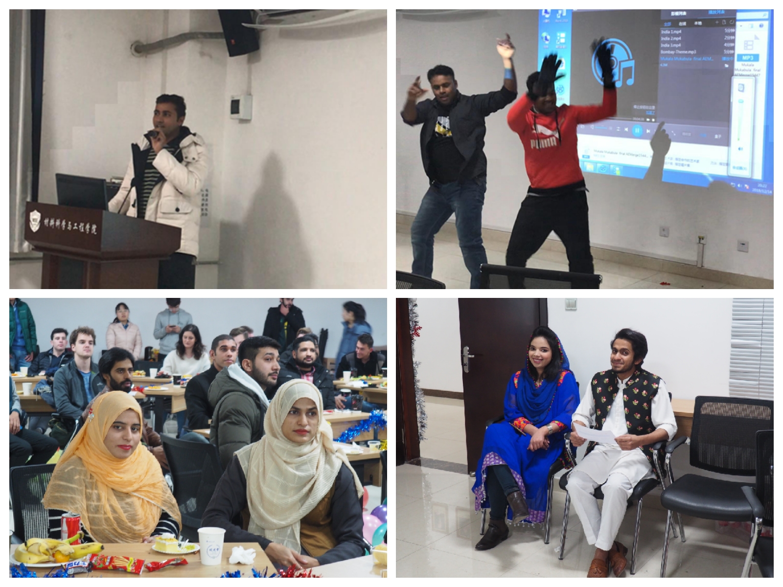 紧接着由西迁精神宣讲团成员杨莎莎为大家讲述了“西迁故事”及“西迁请神”,交大人在国家需要时,背起行囊,开拓创新,克服困难,玉汝于成。随后来自埃及、印度、巴基斯坦、埃塞俄比亚、马里和澳大利亚的代表分别展示了他们国家的文化、习俗等,大家纷纷感慨小小会议室里却深刻体会到来自世界不同地区的不同文化、风景及人情。最后,由印度助理研究员代表为大家带来了欢快的印度歌及精彩的印度舞蹈,伴随着欢乐的歌声及阳刚的舞姿,联欢会步入了尾声。