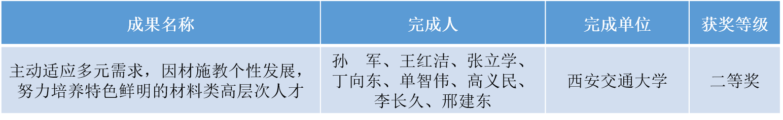 孙军教授、王红洁教授牵头的“主动适应多元需求,因材施教个性发展,努力培养特色鲜明的材料类高层次人才”项目获得国家级教学成果二等奖,项目成员:张立学、丁向东、单智伟、高义民、李长久、邢建东。
