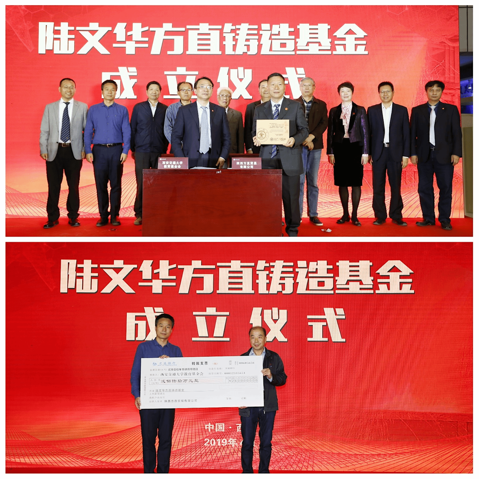 西安交大副校长席光与陕西方直贸易有限公司总经理韩西武签署捐赠协议并赠送捐赠纪念铭牌,西安交大教育基金会秘书长赵卫滨接受捐赠支票。