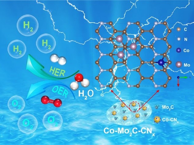 研究团队通过异质界面构筑策略,开发了一种HER/OER双功能全分解水电催化剂。通过对Co-Zn双金属有机框架进行碳化,制备出氮掺杂的多孔碳包裹的Co-Mo2C异质结构电催化剂材料(Co-Mo2C-CNx)。理论计算发现,所构筑的双Mott–Schottky异质界面有利于载流子迁移,促进带电荷激活和转移,提升电催化活性。在碱性介质中,10 mA cm-2时材料的HER和OER过电位分别为92 mV和338 mV,全分解水的驱动电位为1.68 V,经20 h测试后仍表现良好的稳定性,是一种极具潜力的电解水催化剂。研究成果以“Nitrogen-doped carbon wrapped Co-Mo2C dual Mott–Schottky nanosheets with large porosity for efficient water electrolysis”为题在Applied Catalysis B: Environmental(IF=19.503)在线发表(//doi.org/10.1016/j.apcatb.2020.119738)。