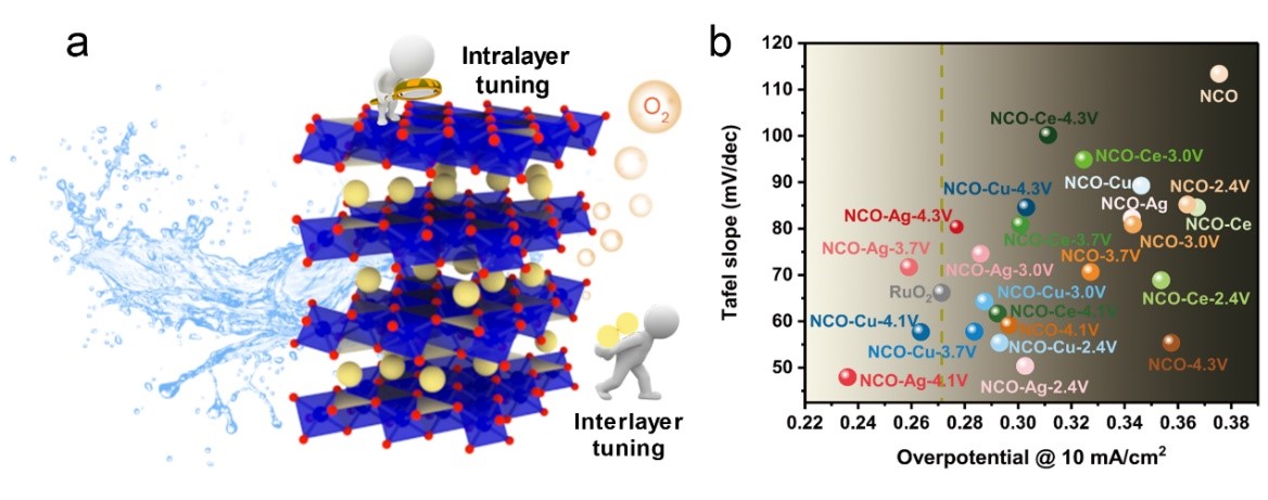 研究团队还基于晶格应力与原子替位的协同调控效应设计开发了一种高效稳定的OER析氧催化剂——层状钴酸钠基材料。利用层间碱金属离子电化学脱出过程引起晶格膨胀及面内收缩,连续调控材料的晶格应力,优化含氧中间体的吉布斯自由能,进一步通过低价态金属离子替代钴Co离子而提高Co的价态,利用高价态Co4+和Co(4+ɛ)+强的电子接收能力加速析氧反应。所制备材料展现出优于商用RuO2催化剂的析氧反应过电位(236 mV, 电流密度10 mA·cm-2)和较小的塔菲尔斜率 (48 mV·dec–1),且稳定性良好,对开发低成本、高效能的析氧电催化剂具有重要的借鉴意义。研究成果以“Lattice strain and atomic replacement of CoO6 octahedra in layered sodium cobalt oxide for boosted water oxidation electrocatalysis”为题在Applied Catalysis B: Environmental(IF=19.503)在线发表(//doi.org/10.1016/j.apcatb.2021.120477)。