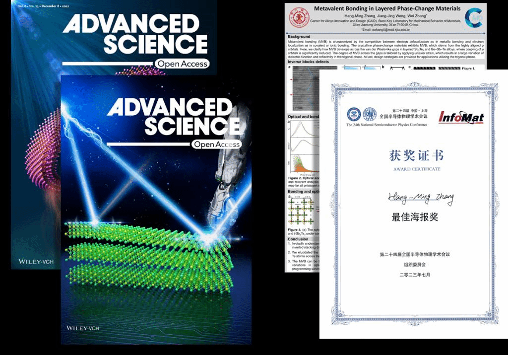 在攻克科研难题时,张航铭虚心向导师和学长学姐请教,并不断优化提升,形成良好的正反馈机制,在科研工作中以高标准严格要求自己,不断取得进步,收获了累累硕果。硕士期间在Advanced Science、《科学通报》高水平期刊累计发表研究性论文5篇,其中以(学生/共同)一作发表的论文2篇,在投3篇,累计影响因子近60,有2篇论文遴选为Advanced Science期刊的封面论文,其中对层状相变材料的键合机理研究在第24届全国半导体物理学术会上从300多个参赛作品中脱颖而出,获得InfoMat最佳海报奖。