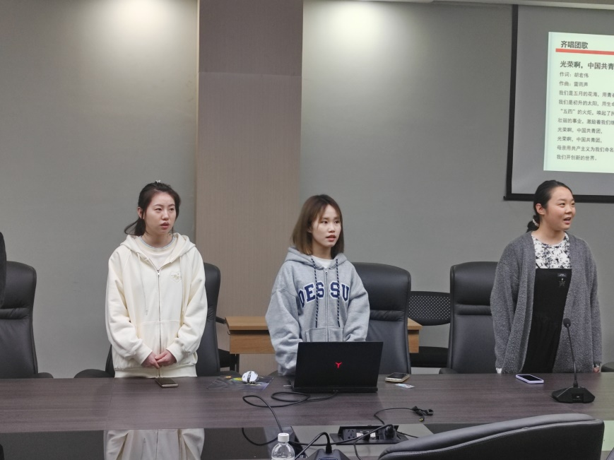 首先,团支部成员一起合唱《光荣啊,中国共青团》。通过齐唱团歌的教育和引导方式,支部的各位成员从内心深处端正了自己的态度,从而加深了对于此次团日活动的重视程度,这有助于支部成员世界观、人生观和价值观的正确塑造,最终达到增强团组织的凝聚力和战斗力的目的。