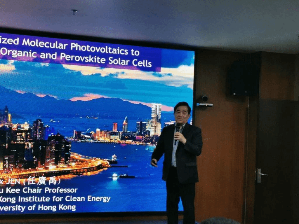 仪式结束后,在仲英楼第一会议室,任广禹院士为师生带来一场题为《Printable Organic and Perovskite Solar Cells for Clean Energy》的高水平学术报告,丁向东院长为任院士颁发周惠久论坛终身成就奖。