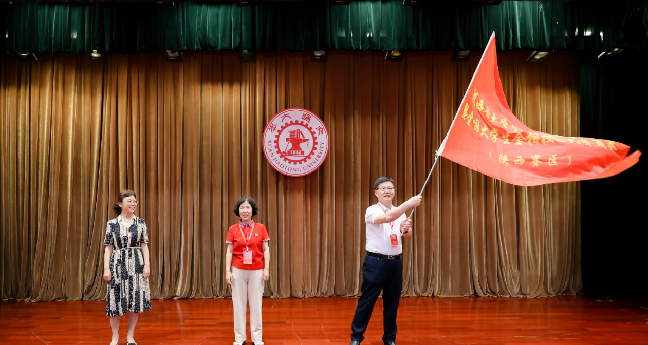 王红洁将大赛赛旗通过陕西赛区竞赛委员会常务副主任委员兼秘书长葛利玲,传递给西安文理学院一品探花