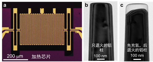图1. 自主设计制作的原位加热芯片。未充氢铝柱和充氢铝柱加热后的对比图,后者出现大空腔。