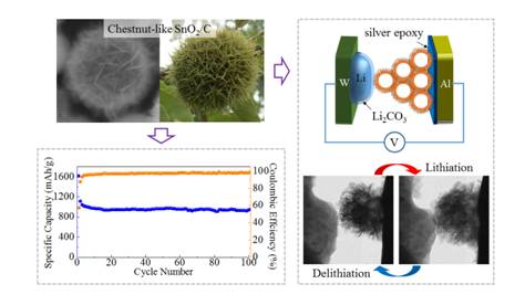 微纳中心(CAMP Nano)的研究人员在锂离子电池负极材料的制备研究方面取得最新进展。通过改进的水热方法,成功合成板栗状SnO2/C复合纳米颗粒,获得了优异的循环稳定性能,并借助先进的原位透射电子显微镜技术对颗粒在充放电过程中的变形行为进行研究,揭示了循环稳定性与体积膨胀率之间的联系。上述研究成果近日在线发表在材料科学领域知名期刊《Nano Energy》上(影响因子11.553,)。