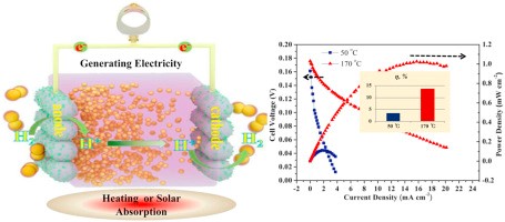 热流科学与工程教育部重点实验室陈黎教授合作进行了该电池的热电转化效率计算。该氢离子浓差热电池采用了燃料电池结构,利用离子浓差电池原理,实现了热-电转换。该电池的工作原理如下:氢气从阳极进入电池被氧化成氢离子,在阳极和阴极两侧形成离子浓度差,离子由阳极扩散通过质子交换膜后到达阴极又被还原成了氢气,在这个过程中氢气没有消耗,但贡献了电子,产生了电流,整个过程实现了热-电能转化。在170 oC工作时,该体系的电流密度最高可达21 mA cm-2,功率密度最高可达10.3 Wm-2,热-电转换效率达到了13.72%,该效率高于目前报道的热电材料的转换效率。基于燃料电池的结构特征,该电池也可以通过串联形成电池堆,提高电池的输出电压和功率。该项研究成果为热能利用提供了新途径。