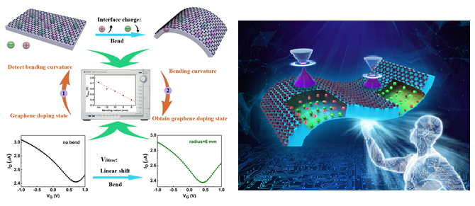 功材中心设计出一种新型全无机柔性石墨烯场效应晶体管(GFET),利用纯机械应变和铁电薄膜Pb0.92La0.08Zr0.52Ti0.48O3的挠曲电效应成功地实现了石墨烯掺杂浓度的可控,发现石墨烯的狄拉克点(VDirac)随着GFET弯曲半径(正向弯曲或反向弯曲)呈线性变化。相比于其他调控石墨烯掺杂的方法,本工作具有以下优点:1)避免了杂化掺杂对石墨烯造成的破坏以及化学修饰掺杂带来的其他物质吸附;2)可逆、可控的;3)柔性的。基于以上的优点,我们所设计的全无机柔性石墨烯场效应晶体管不仅可以通过弯曲机械应力调控石墨烯掺杂,而且还可以根据柔性铁电栅GFET的VDirac变化来检测样品的弯曲状态。