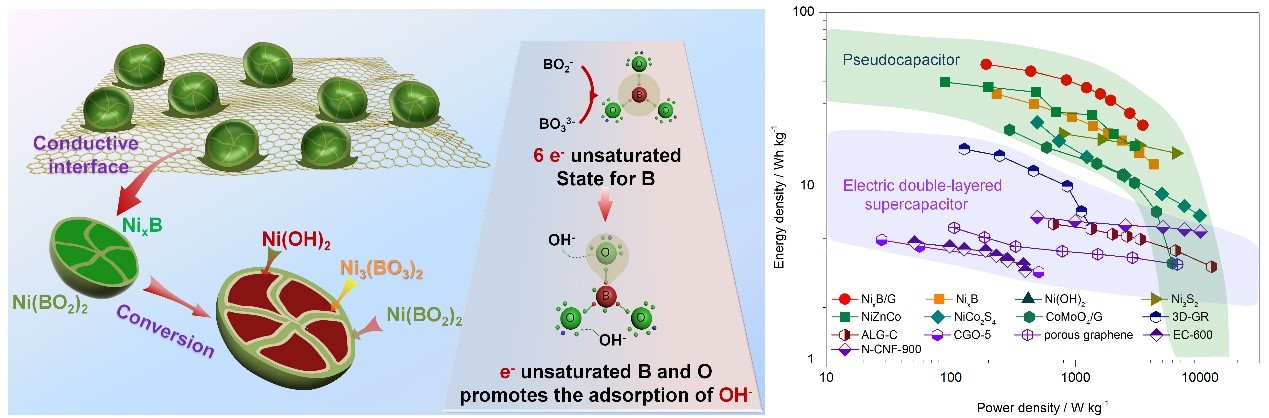 金属材料强度国家重点实验室柳永宁教授和陈元振副教授课题组联合澳大利亚伍伦贡大学郭再萍教授和周腾飞研究员课题组,在前期偏硼酸盐增强(Ni,Co)(OH)2结构稳定性以提高循环寿命(Nano Letters,2017, 17, 429-436)研究工作的基础上,制备出了具有核壳结构的硼化镍@偏硼酸镍复合材料,将其用于非对称超级电容器正极,表现出优良的电容性能。究其原因,一方面是较小的颗粒尺寸有效地提高了材料利用率并降低离子的扩散路径;另一方面,复合材料厚的偏硼酸镍(Ni(BO2)2)壳层,因其BO2-中B原子处于电子不饱和状态,与硼酸显酸性的机理(B(OH)3 + H2O = B(OH)4- +H+)类似,Ni(BO2)2也容易吸附OH-,这促进了电化学反应动力学,因此,使活性材料拥有了优良的倍率性能和循环性能。向复合材料中加入石墨烯后,进一步提高了导电性,使其表现出更高的比容量和和优异的循环性能.