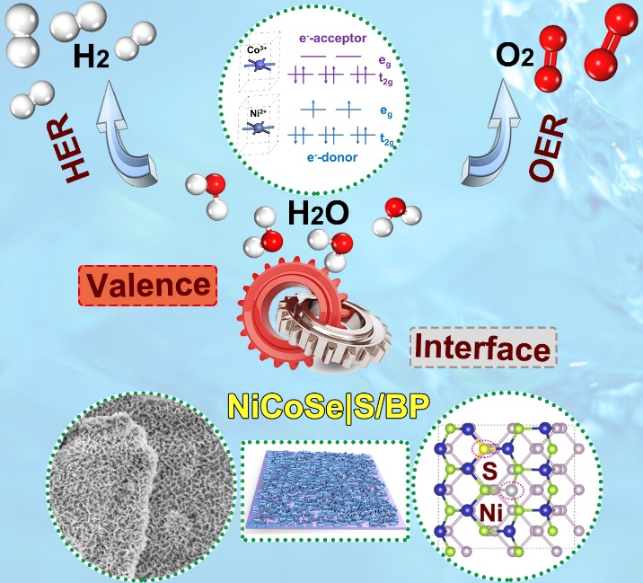 表面工程研究室戴正飞研究员和马飞教授与国内外科研人员合作,通过共沉淀法与一步硒硫化法,首次在黑磷(BP)纳米片上原位构筑了非金属S元素掺杂的NiCoSe纳米片结构,并将这一异质复合材料用于高效HER/OER双功能电催化全解水研究。在NiCoSeS/BP复合结构中,p型BP中高氧化性的空穴可将低价Co2+氧化成高价、得电子能力更强的Co3+,利于OER反应的发生;非金属S元素与Se元素的电负性差异,也进一步调控了Co3+/Co2+和Ni2+/Ni3+比例,改善了材料电子接受/给予特性,有利于OER/HER全分解水过程。将之用于分解水电催化反应,在10 mA cm−2的电流密度下,其HER和OER的过电位低至172 mV和285 mV,全分解水驱动电位仅需1.67 V,并具有较好的稳定性。同时,研究人员创新性地结合电学气敏分析技术,考察了异质复合材料的湿度敏感性与亲水性,可对其电催化化分解水性能进行一定的预测佐证;第一性原理计算结果也证实了NiCoSeS/BP具有更小的氢吸附自由能和OER反应能垒。本研究工作为金属硫属化物基高性能全解水电催化剂的结构成分设计提供了新思路。