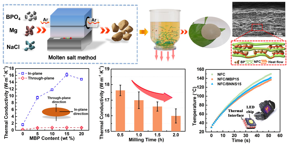 夏鸿雁副教授课题组通过低成本熔盐法成功合成了BP粉体颗粒,随后将BP颗粒作为导热填料,与纳米纤维素通过真空抽滤的方法制备得到BP /纳米纤维素复合薄膜。复合薄膜中BP与纳米纤维素通过氢键结合,进而有效降低了两者间的界面热阻。除此之外,结构中BP颗粒相互接触,在面内形成短程有序排列,与纳米纤维素形成了有效的导热通道,这极大地提高了聚合物复合材料的散热能力。BP /纳米纤维素复合薄膜最高热导率能达到17.6 W/m·K,并且具有良好的绝缘性和机械性能。相关工作以“Enhanced thermal management performance of nanofibrillated cellulose composite with highly thermally conductive boron phosphide”为题发表在国际期刊Journal of Materials Chemistry A上,一品探花