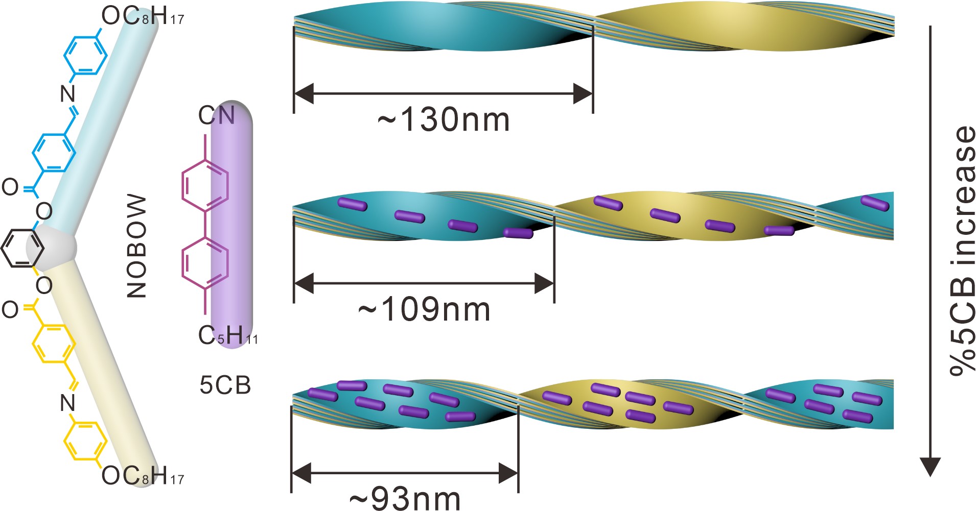 、物理学院与美国劳伦斯伯克利国家实验室研究人员合作,利用共振软X射线散射(RSoXS)研究了这一结构在非手性小分子(5CB与正辛烷)掺杂条件下的自组装行为,从分子层面解析了结构中的分子排布模式以及螺距调控机理。