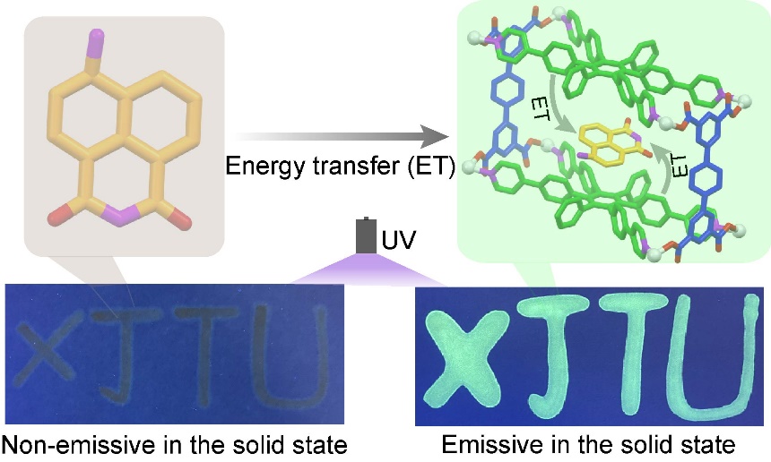 的张明明教授课题组以六苯基苯衍生物为发光配体,与四齿羧酸以及Pt基配体的多组分自组装,成功构筑了三种具有不同构型的金属笼状化合物。进一步地,利用发光良好的金属笼作为供体,以萘酰亚胺衍生物作为受体,构建了在液态和固态下的光捕获系统。由于金属笼具有三维的空腔结构,在固态下可以利用其空腔与受体分子有着紧密的堆积,在固态下的能量转移效率相比液态下具有明显的提升(23.3%到83.0%)。这一策略可以用于激发在固态下不发光的萘酰亚胺衍生物分子,使其发出黄绿色的荧光,为构筑固态发光的超分子材料提供了一种手段。