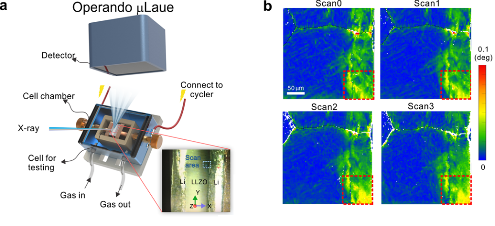 基于上述分析,针对机理研究与实际服役工况差异较大的问题,采用原位同步辐射微束劳厄衍射技术,利用其时空分辨率高、晶体取向与应力测量准、微观缺陷检测灵敏的优势,设计构建全固态电池多场耦合原位实验装置与方法,捕捉固态电解质中微观应力应变及缺陷在电化学循环中的空间分布与时间演变动态过程,探明全固态电池中锂枝晶形核生长的电化学-力学耦合作用机理。该方法同时具备厘米级观测尺度与亚微米级分辨率,克服锂枝晶难以捕捉的困难,深度研究锂枝晶孕育、形核、生长早期固态电解质微观组织结构的演化,为理解锂枝晶生长导致全固态电池失效提供重要实验基础。验证性实验及结果如下图所示。