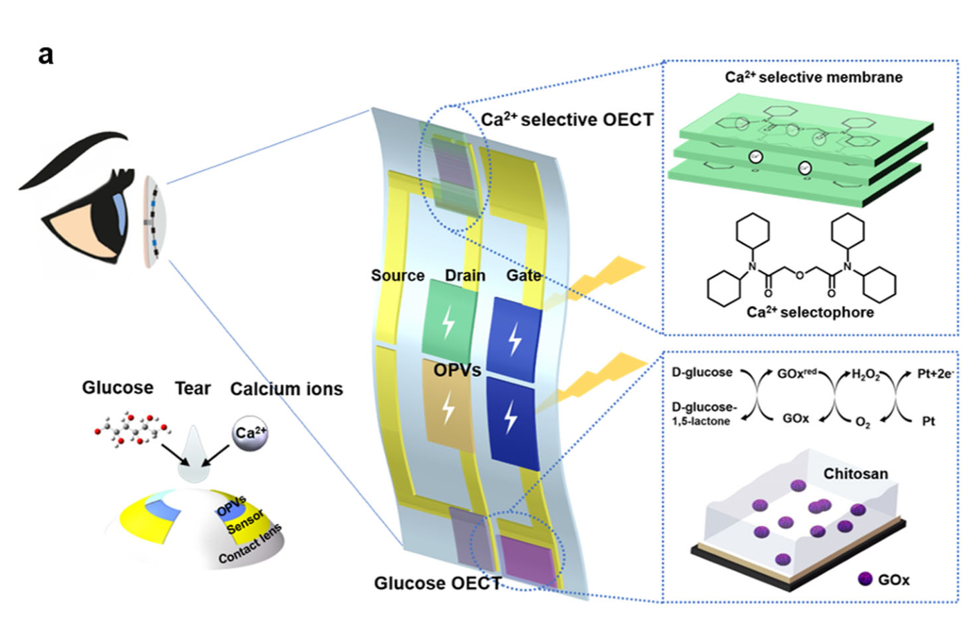 (a)集成器件与隐形眼镜示意图,插图为Ca2+和葡萄糖传感器的栅极修饰层
