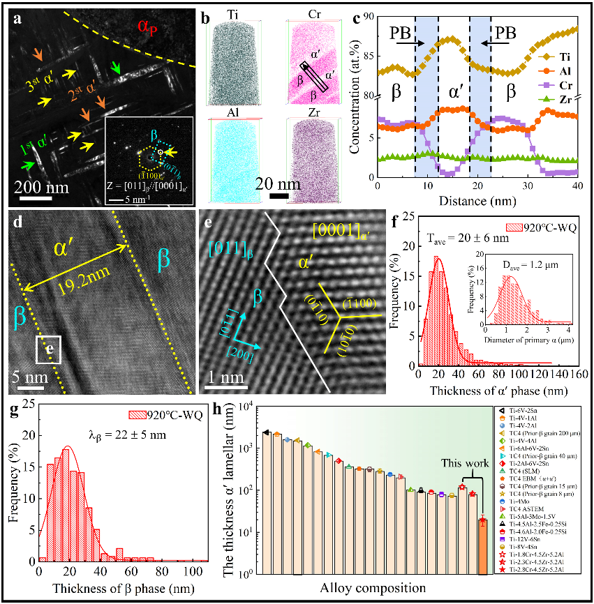 图1.多层级纳米马氏体Ti-2.8Cr-4.5Zr-5.2Al合金水冷后的微观组织与成分分布