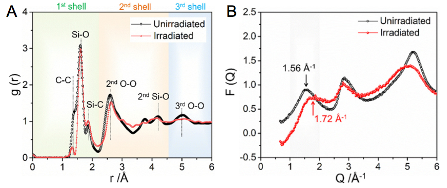 图1 高能离子辐照前后非晶SiOC陶瓷结构短程、中程有序结构的变化,(A)径向分布函数,(B)结构函数