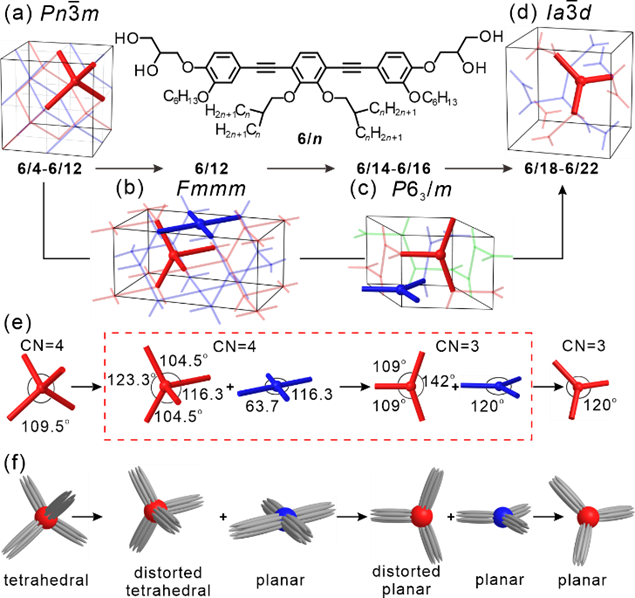 刘峰教授团队与德国马丁路德·哈勒维腾贝格大学的Carsten Tschierske教授合作,并借助上海同步辐射光源(SSRF)小角X射线散射线站与我校分析测试中心的小角X射线散射仪,研究了一系列多亲性同系物分子在不同温度下的自组装行为,首次提出了一种新的DD-DG相变路径:将DD结构的四面体节点扭曲得到Fmmm结构的扭曲四面体节点和平面四重节点,进一步在六方P63/m结构中变为扭曲的和非扭曲的三重平面节点,最后得到只有非扭曲三重节点的DG结构。相变过程中结构的配位数(CN)的变化为4-4-3-3。相变过程以能量最低为原则,极小曲面与节点的六边形密排互相竞争,得到具有不同节点形状的四种结构。该研究所提出的全新的DD与DG结构之间相变机制,对从结构和分子层面更深入理解相变过程和进一步调控相变具有重要指导意义。