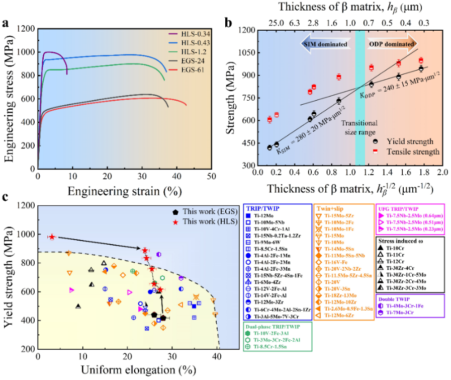 图2.异质叠层Ti-1Al-8.5Mo-2.8Cr-2.7Zr合金的力学性能与变形机制转变的临界尺寸预测,及其与目前已报道的亚稳态钛合金的力学性能对比。