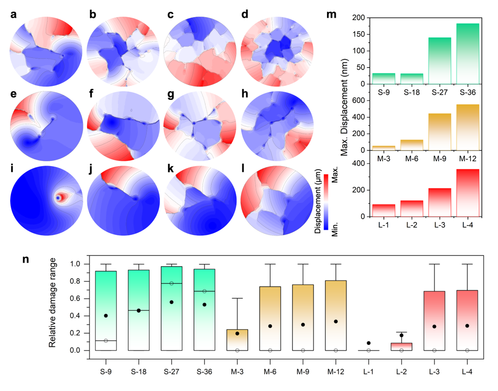 (1) 采用多物理场模拟方法建立了电化学-力学耦合模型,对固态电解质内部锂细丝生长引起的失效过程进行了系统研究,通过应力场动态演变、局部位移和相对损伤的可视化,揭示了裂纹形成及其在固态电解质内扩展过程。研究结果表明,固态电解质的局部位移是应力传递的结果,导致固态电解质内部的结构损伤和裂纹形成。锂细丝几何构型起伏区域引起的各向异性应力场以及相对位移加剧了固态电解质的结构损伤,固态电解质内部锂细丝的数量和尺寸对应力场分布和局部位移至关重要,小尺寸锂细丝的弥散分布促进相邻细丝间连续应力网络的形成,加速了损伤在固态电解质内部的传递。该成果以《内部锂细丝生长引发的固体电解质电化学-力学失效》(Electro-chemo-mechanical failure of solid electrolyte induced by growth of internal lithium filaments)为题发表在材料领域知名期刊《先进材料》(Advanced Materials)上(图1,Adv. Mater. 2022, 34, 2207232)。