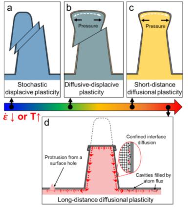 基于上述发现,具有氧化壳的亚微米自支撑铝柱的变形行为可以总结如下。随着试验温度升高或应变速率降低,样品变形可依次由随机位移型塑性、扩散-位移型塑性、短程扩散型塑性和长程扩散型塑性四种塑性机制主导(如图3所示)。位错滑移或孪晶介导的位移型塑性通常会产生滑移台阶或变形带,导致微米级样品的变形可控性较差。对于耦合的扩散-位移型塑性(图3b),扩散变形发生在相对较低的应力水平下,随后在应力集中部位激活位移型塑性。变形温度的进一步升高或应变速率的降低可以导致完全扩散型塑性变形(图3c和图3d),其具有两种因扩散距离而异的形式。在相对较低的测试温度或较高的应变率下,在界面中流动的原子被堵塞在接触区附近的一个小体积内,产生内部压力,导致氧化层膨胀形成蘑菇形状(图3c)。然而,在相对较高的测试温度或较低的应变率下,由于扩散率呈指数级升高,原子可以缓慢扩散到更长的距离,从而以最小的能量消耗寻找容易重新沉积的位置。