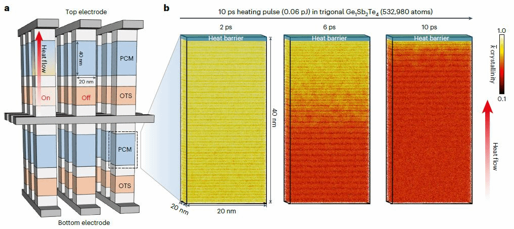 金属材料强度国家重点实验室材料创新设计中心张伟教授和牛津大学化学系Volker L. Deringer教授通力合作,利用先进的机器学习方法并基于高斯近似势能GAP框架,开发了一个适用于锗锑碲合金的机器学习势能函数(Machine-Learned potential)。该势能函数兼具传统力场的计算效率和量子力学的计算精度,能够准确描述伪二元线上的任意组分的锗锑碲合金的复杂结构特征以及可逆相变过程。同时,团队考虑了结构相变引起的密度变化、脉冲产生的温度梯度、电场作用下的离子迁移过程以及结构弛豫等影响,使得原子模拟更加接近相变器件真实的服役过程。如图1b所示,团队实现了三维堆叠芯片相变单元擦除过程所涉及的脉冲诱导熔化过程的原子模拟。该方法具有非常高的扩展性,可模拟器件界面对相变过程的影响,有助于进一步优化器件的尺寸与结构。
