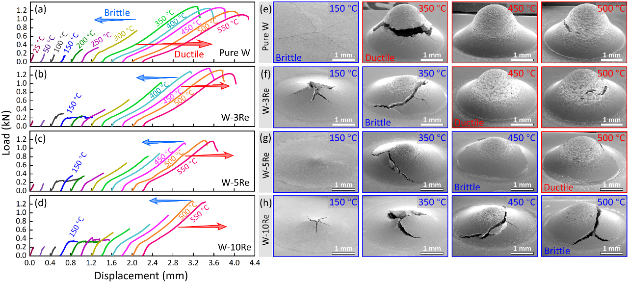 人造太阳-核聚变能是人类未来能源的终极解决方案。钨(W)因其具有高熔点、高温强度、高导热率、低氢(H/D/T)滞留率和抗辐照损伤等优异的性能,被誉为面向等离子体第一壁的最佳候选材料。然而,过渡金属钨的低温韧性差、韧脆转变温度高,极大地限制了钨的加工和应用。如何克服钨的低温脆性成为以钨为代表的难熔金属研究领域的关键科学难题之一。为此,各国研究者在钨的低温增韧方面开展了一系列的研究工作。长期以来,大量的模拟计算结果表明,铼(Re)合金化可以改变螺位错的三维核心结构,从而促进螺位错双扭折形核,提高螺位错的滑移能力,最终可改善W的变形能力,实现W的低温韧化。因此,Re被认为是提高W变形能力并降低其韧脆转变温度的最佳合金元素。在大量的实验研究中,报道的“Re效应”通常与机械加工(高温轧制等)引入的初始位错、层片结构、晶粒细化等因素混淆在一起,难以澄清单一因素(Re合金化)对W变形能力的影响。因此,Re合金化能否实现低温增韧、降低W的韧脆转变温度,一直缺乏系统的研究和关键的实验证据。