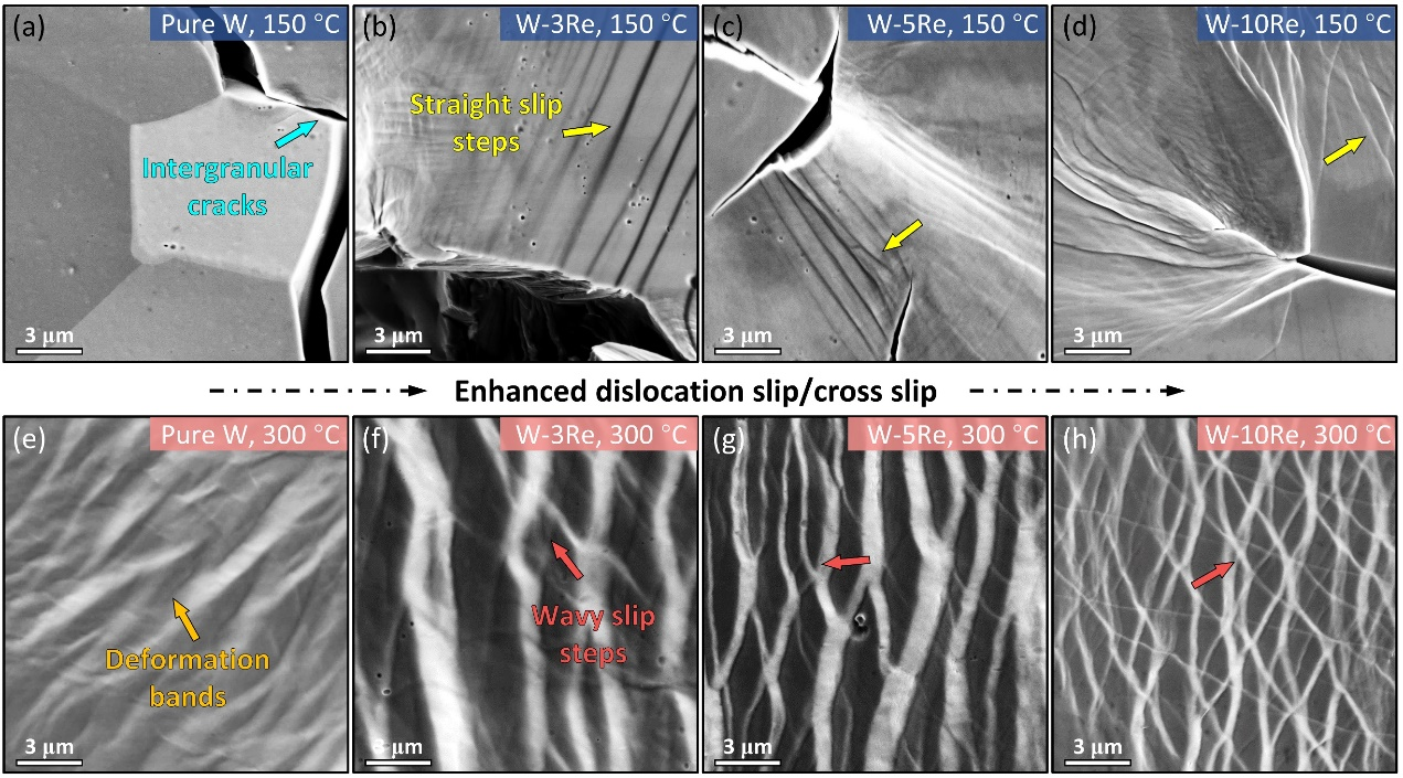 韩卫忠教授团队通过冲杆试验(Zhang YH, et al. Acta Materialia 220 (2021) 117332),对再结晶态的W-Re合金进行了系统研究,揭示了其韧脆转变的关键缺陷机制,并阐明了低含量(≤10 wt.%)的Re合金化并不能有效降低W的韧脆转变温度。研究人员发现Re合金化引起的有限韧化仅发生在很窄的低温区间(50 °C~200 °C)。高温(≥300 °C)变形时,W-Re合金的塑性变形能力明显降低,最终导致合金高温韧性下降、韧脆转变温度升高。而且Re含量越高,W-Re合金的韧脆转变温度越高(如图1所示)。通过表面变形形貌的表征发现,相比于纯W的沿晶开裂,Re合金化促进了更多的位错行为,从而增加了W-Re合金的低温韧性,但这一改善非常有限。此外,当变形温度升高到300 °C时,W-Re合金中还出现了大量的位错交滑移现象。随着Re含量的增加,交滑移程度越来越剧烈(如图2所示)。有趣的是,虽然W-Re合金在高温下发生了大量的位错交滑移,但其变形能力和韧性反而变差了。