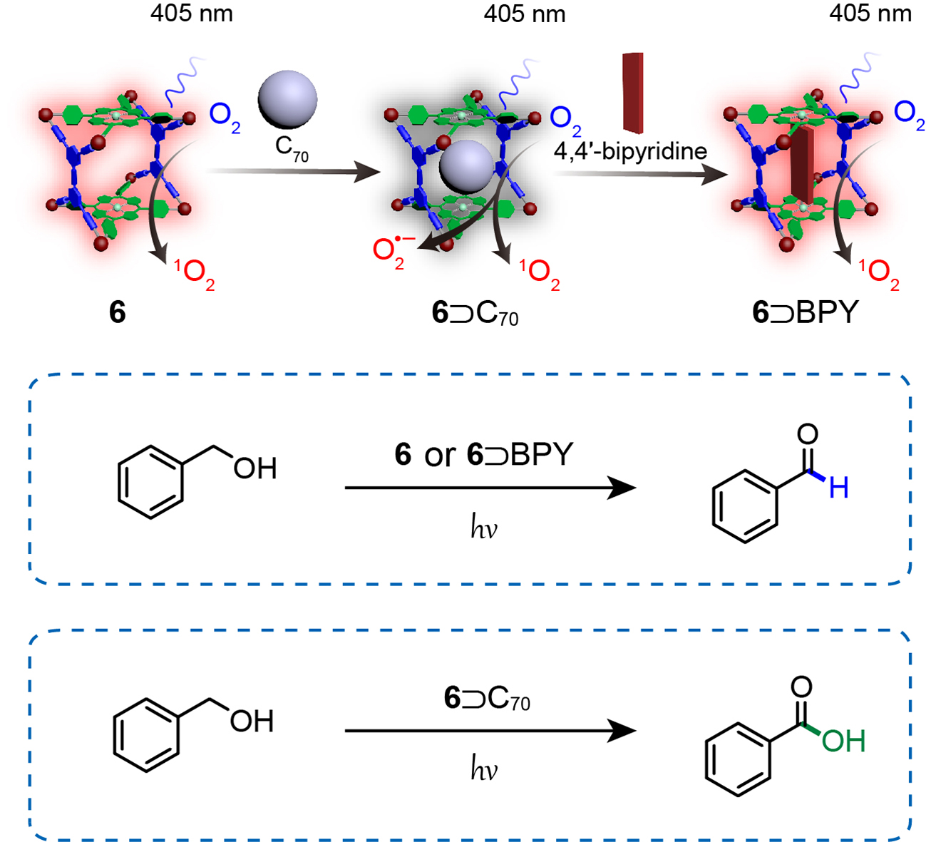 张明明教授课题组通过配位自组装,构筑了一类基于卟啉的多组分金属笼,并通过金属笼的主客体性质来调控活性氧物种的产生,实现了对苯甲醇的选择性光催化氧化。作者研究发现,在405nm光激发下,金属笼(6)能够有效地通过激发态能量转移的方式生成单线态氧(1O2)。然而,当金属笼(6)与C70结合形成主客体配合物(6⊃C70)后,电子转移途径被打开,从而促进了超氧阴离子自由基(O2·−)的产生,同时生成1O2与O2·−。接着,在配合物6⊃C70中引入4‘4-联吡啶(BPY)时,可以与金属笼配位形成稳定性更高的配合物(6⊃BPY),将C70从空腔中挤出去,恢复高效的1O2产生能力。接下来作者对苯甲醇光催化反应进行了探究。结果表明,配合物6和6⊃BPY可以有效的将苯甲醇氧化为苯甲醛,而配合物6⊃C70则可以将其氧化为苯甲酸,该类反应的产率与选择性都可以达到90%以上。本研究不仅展示了一种可调控的基于金属笼状化合物的主客体识别模式,还探讨了其在选择性光催化中调节活性氧(ROS)生成的潜力。近日,该研究成果以《卟啉金属笼主客体化学调控活性氧的生成用于选择性光催化》(Guest-Regulated Generation of Reactive Oxygen Species from Porphyrin-Based Multicomponent Metallacages for Selective Photocatalysis)为题发表在国际化学领域权威期刊《德国应用化学》(Angewandte Chemie International Edition)上。该论文第一作者为西安交大一品探花