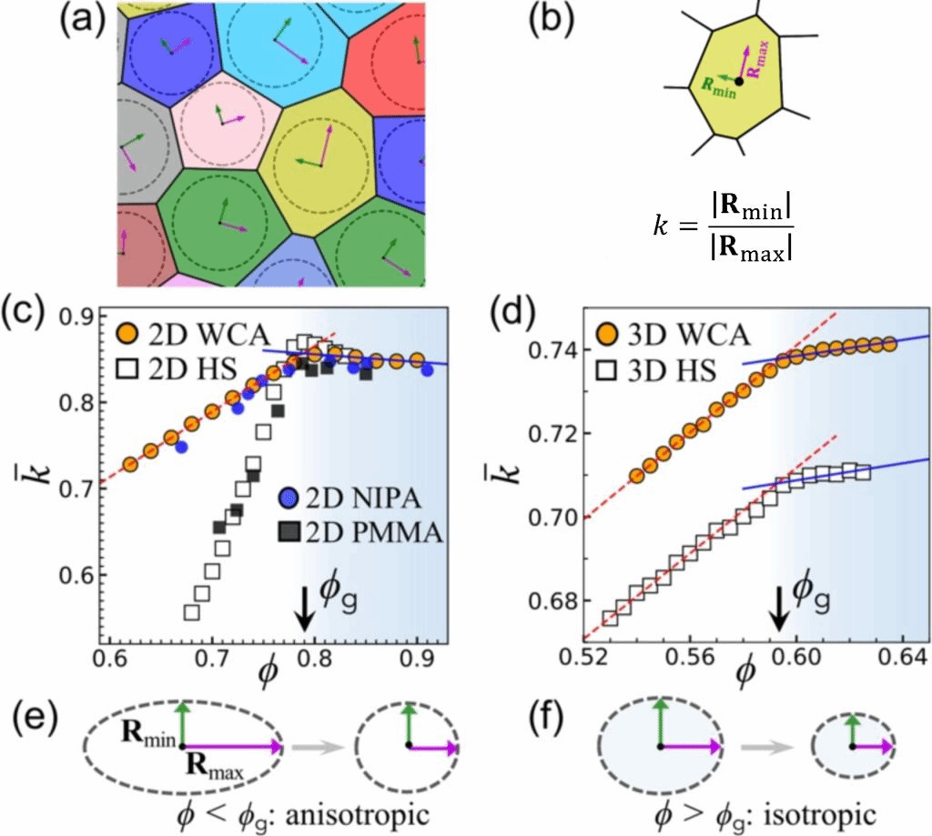 张会军副教授、刘峰教授与香港科大章琪博士、韩一龙教授合作,基于局部笼结构的Voronoi构造,提出各向异性结构参量k = Rmin/Rmax (Rmin和Rmax分别代表Voronoi单元的短轴和长轴),具有明确的几何含义,在模耦合理论(mode-coupling theory)推测的玻璃转变处表现出明显的变化(图1),揭示了玻璃转变是从局部结构不均匀形变的液体到均匀形变的固体变化的过程,这在二维和三维系统中具有鲁棒性(如下图)。相关论文以《笼结构各向异性-各向同性转变揭示玻璃转变的结构特征》(Anisotropic-Isotropic Transition of Cages at the Glass Transition)为题发表于Phys. Rev. Lett.期刊。