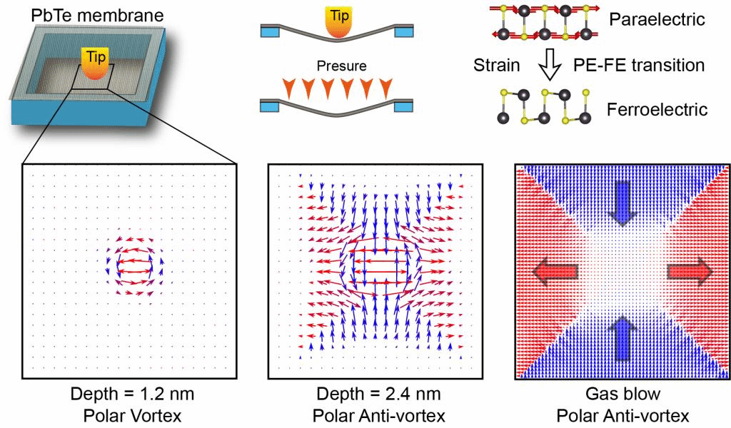 的邓俊楷教授课题组,与航天学院的刘益伦教授和墨尔本大学的刘哲教授通力合作,通过多尺度模拟方法,将铁电极化拓扑结构及其调控拓展到二维铁电材料中。首先,研究团队利用第一性原理计算,发现二维PbX(X = S,Se,Te)材料可通过应变诱发“顺电-铁电”相变,并确定了材料的“应变-极化”相图;随后,基于二维PbX材料具有优异的面外屈曲变形的特点,研究团队采用基于深度学习势的大规模分子动力学,模拟“纳米压痕”实验,发现二维PbX材料在复杂应变场条件下可诱发“类斯格明子”的极化涡旋拓扑结构;最后,利用有限元模拟,通过设计不同几何压头的纳米压痕或压力鼓泡等机械载荷导致的复杂应变场,在二维PbX材料中实现了可回复的极性涡旋、反涡旋和通量闭合畴等多种二维曲面铁电极化拓扑结构。研究工作证明了利用复杂应变场,可在柔性二维铁电材料中,设计各种可逆的极化拓扑结构,有望为开发基于新型二维铁电材料的高密度存储器和传感器等功能器件提供新的思路。