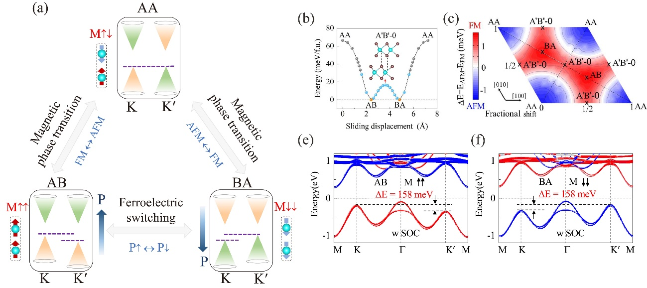 李平副教授与淮阴工学院荀威博士等人提出一种机制,通过二维双层材料的层间滑移实现对磁性、铁电和谷极化的操纵。重要的是,作者在双层GdI2体系证实了这种机制的可行性。双层GdI2的磁基态和谷极化可以通过滑移铁电实现强耦合,并且呈现出可调控和可逆性。此外,作者通过自旋哈密顿量和层间电子跃迁揭示了滑移铁电诱导磁相变的微观物理机制。这一研究,为二维多铁器件提供了一个新的方向,对下一代电子、谷电子和自旋电子器件具有重要意义。