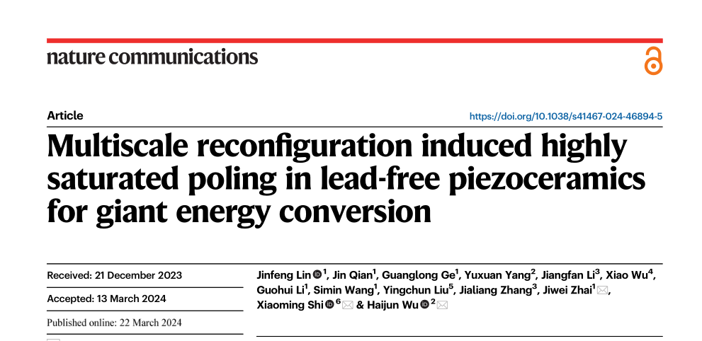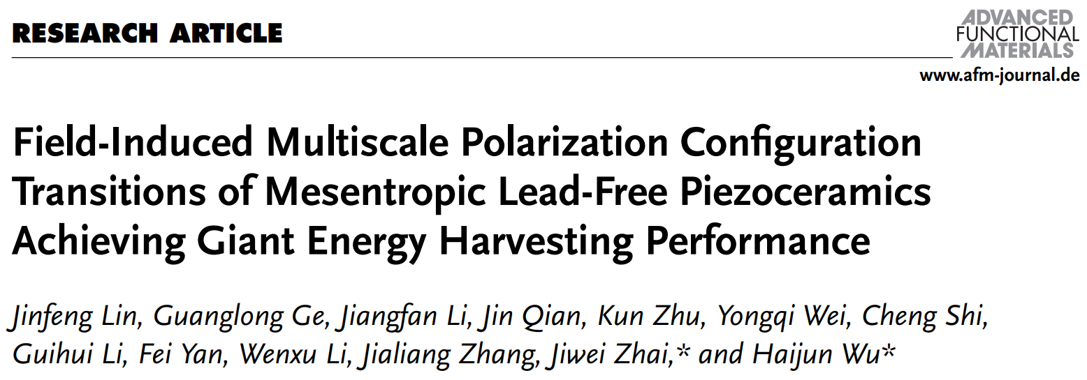 相关成果以“Multiscale reconfiguration induced highly saturated poling in lead-free piezoceramics for giant energy conversion”(《多尺度重构诱导无铅压电陶瓷高度饱和的极化,实现了巨大的能量转换》)为题发表在《Nature Communications》上;相关成果以“Field-Induced Multiscale Polarization Configuration Transitions of Mesentropic Lead-Free Piezoceramics Achieving Giant Energy Harvesting Performance”(《场诱导多尺度极化构型转变调控无铅无压电陶瓷的亚稳相状态,实现了巨大的能量收集性能》)为题发表在《Advanced Functional Materials》上。这两篇工作的通讯作者是同济大学的翟继卫教授和一品探花