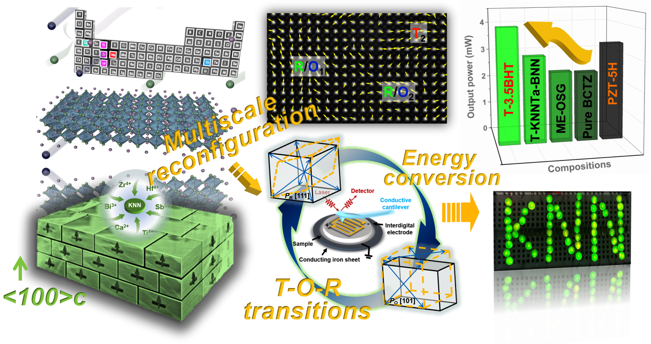 武海军课题组与同济大学翟继卫教授团队通力合作,利用织构化工艺以及中熵诱导NPB相界之间的协同优化,基于模板晶体生长法(TGG)以及两步烧结法制备了T-xBHT织构压电陶瓷,深入探究了多尺度重构对xBHT压电陶瓷性能的影响规律。所开发的KNN基陶瓷具有优异的综合压电性能(d33 ~ 680 ± 35 pC/N, kp ~ 72.5%)和良好的居里温度(~ 260 ℃),展示出超高的能量收集性能和良好的超声换能特性,在无铅和铅基压电陶瓷中都具有很强的竞争力。综合结构分析表明,电场诱导的高效多尺度极化配置的不可逆翻转极大地促进了高饱和的极化。该项工作不仅展示了高性能KNN基压电陶瓷设计的新思路,并为压电性能和潜在的多尺度结构之间建立了密切的联系。