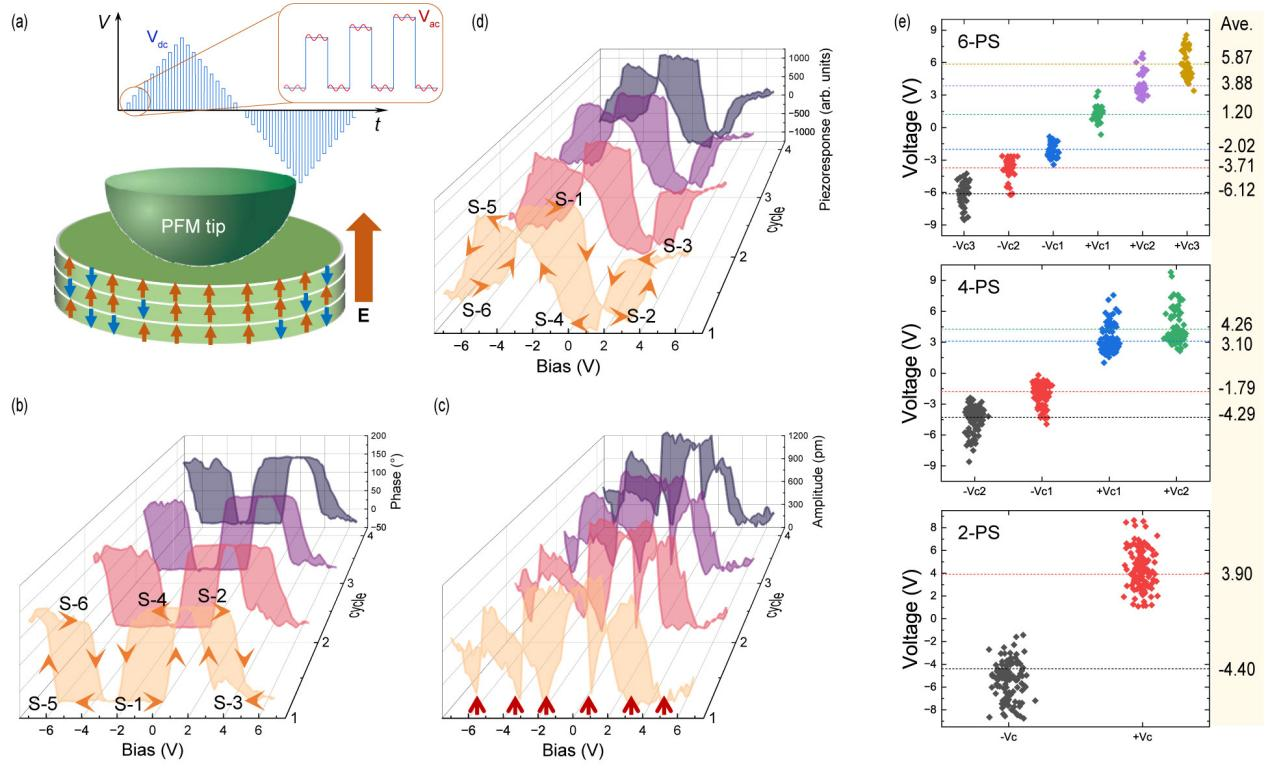 图1(a)基于压电力显微镜的电滞回线测试示意图;(b)-(d) CuInP2S6样品六重极化态转换(S-1到S-6)的相位(Phase)、振幅(Amplitude)和压电响应(Piezoresponse)的滞回曲线;(e)具有六态、四态和二态极化态数的CuInP2S6薄膜矫顽场(Vc)的分布图。