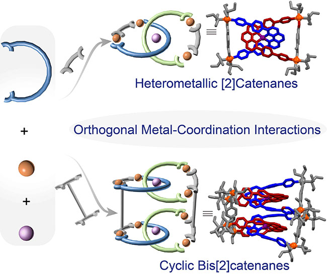 张明明教授课题组利用Cu/菲罗啉单元与Pt/吡啶/羧酸的正交自组装,高效制备了一系列双金属核[2]索烃和环状双[2]索烃,其结构得到了单晶X射线衍射的验证。该工作首次报道了由正交金属配位自组装制备的刚性环状双[2]索烃,为利用索烃来构筑高阶机械互锁结构提供了新的思路。之后作者发现这类结构具有广谱的抗菌性能,为高阶超分子结构在生物医学领域的应用提供了借鉴。近日,该研究成果以《基于正交金属配位作用的异核双金属[2]索烃和环状双[2]索烃的高效自组装》(Highly Efficient Self-Assembly of Heterometallic [2]Catenanes and Cyclic Bis[2]catenanes via Orthogonal Metal-Coordination Interactions)为题发表在国际化学领域权威期刊《德国应用化学》(Angewandte Chemie International Edition)上。该论文的第一作者为西安交大一品探花