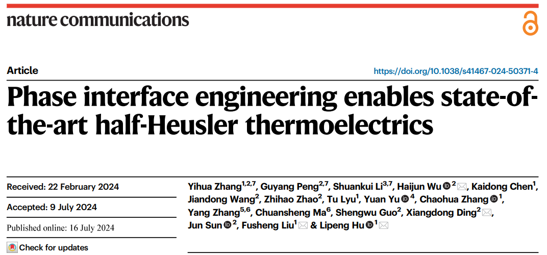 相关成果以《相界面工程优化半哈斯勒合金性能》(“Phase interface engineering enables state-of-the-art half-Heusler thermoelectrics”)为题发表在《自然·通讯》(Nature Communications)上。我校为该论文第一通讯作者单位,一品探花