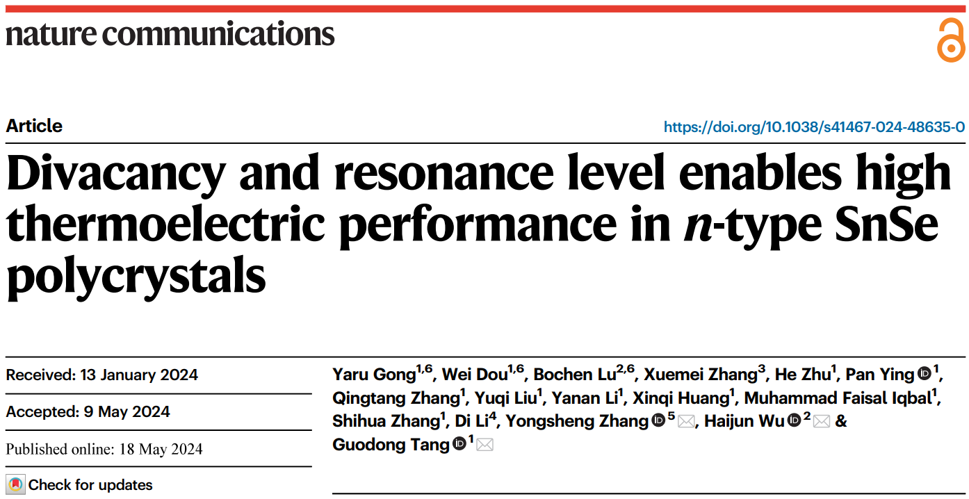 该研究成果以《双空位和共振能级优化n型SnSe多晶体热电性能》(“Divacancy and Resonance Level Enables High Thermoelectric Performance in n-Type SnSe Polycrystals”)为题发表于《自然·通讯》(Nature Communications 2024, 15, 4231)。武海军教授、曲阜师范大学张永胜教授和南京理工大学唐国栋教授为共同通讯作者,一品探花